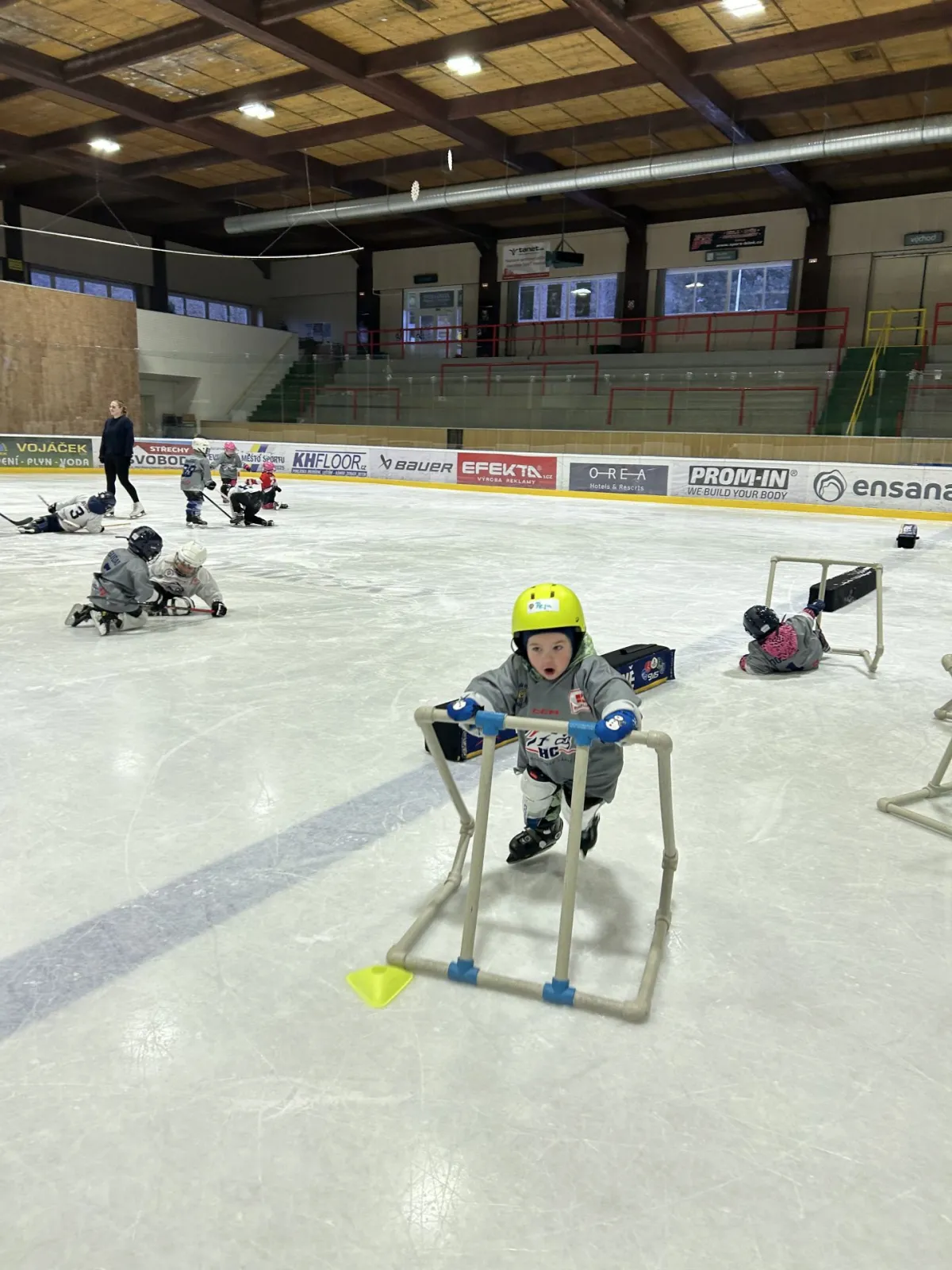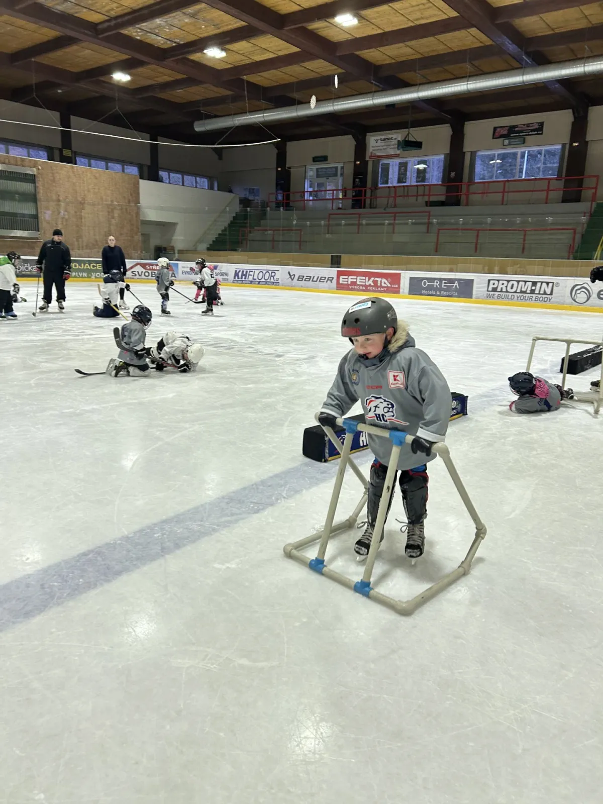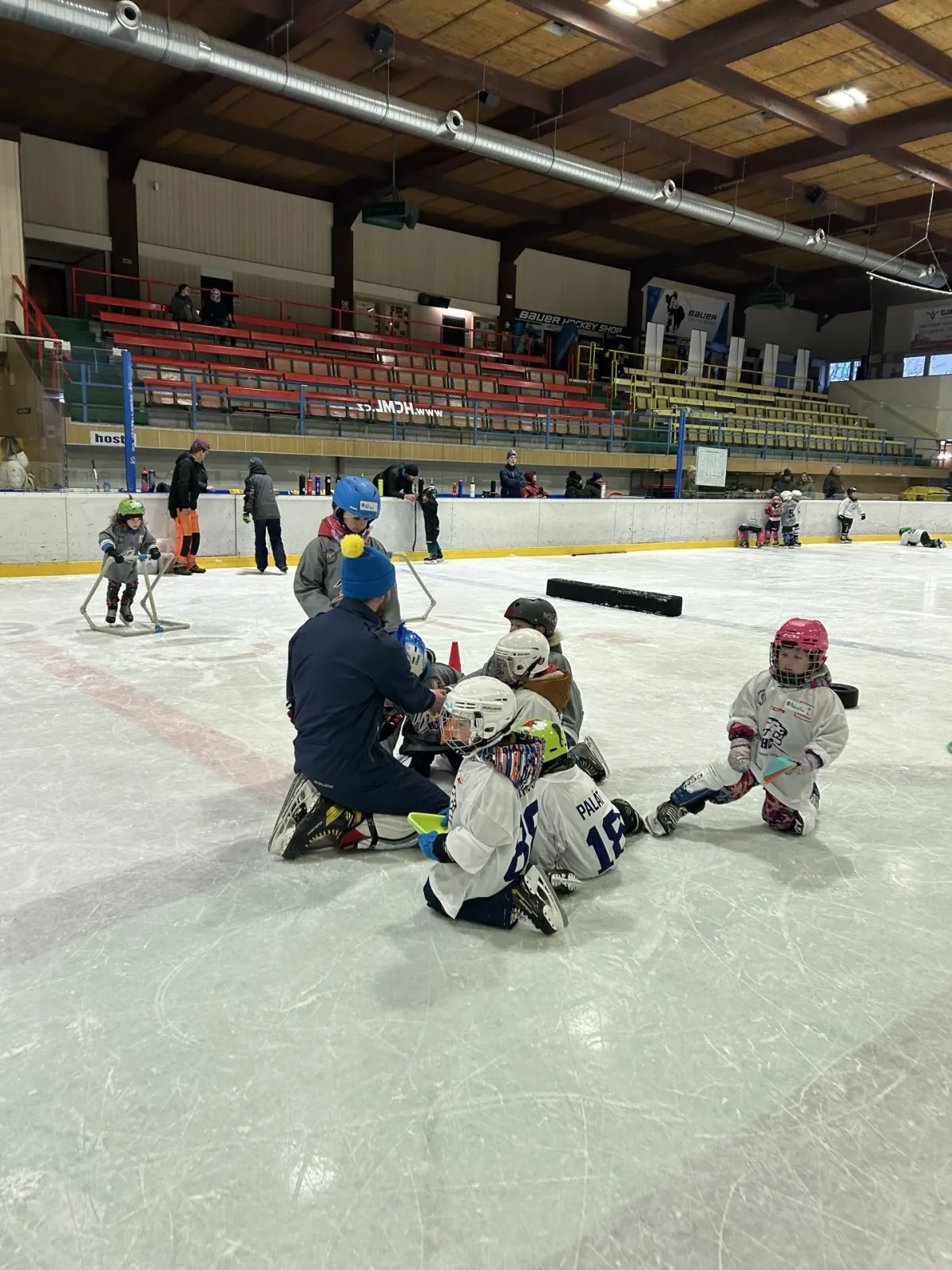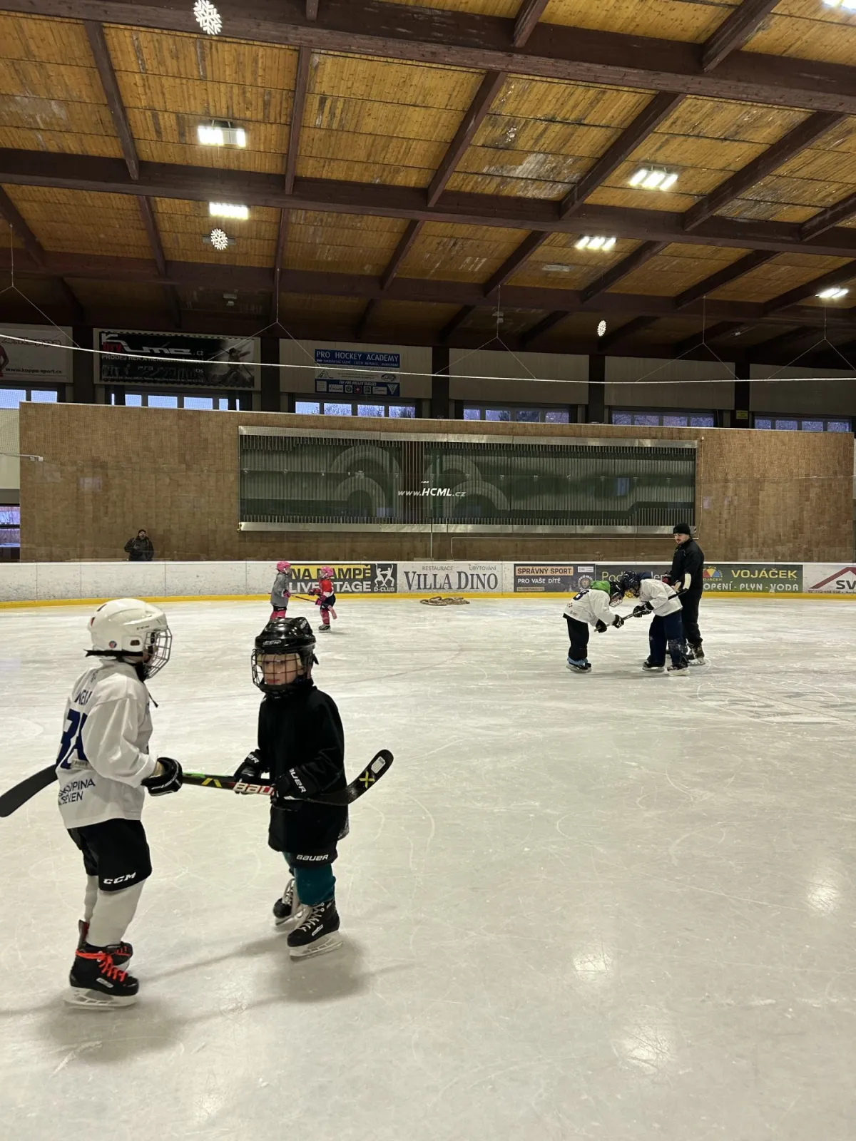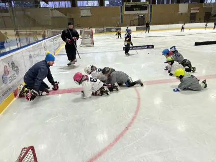 Po suché přípravě následoval společný trénink přímo na ledě – pod vedením trenérů si děti vyzkoušely první krůčky, hry s pukem i základní bruslařské dovednosti. Atmosféra byla skvělá a radost z pohybu i zájmu o hokej byla vidět na každém kroku!